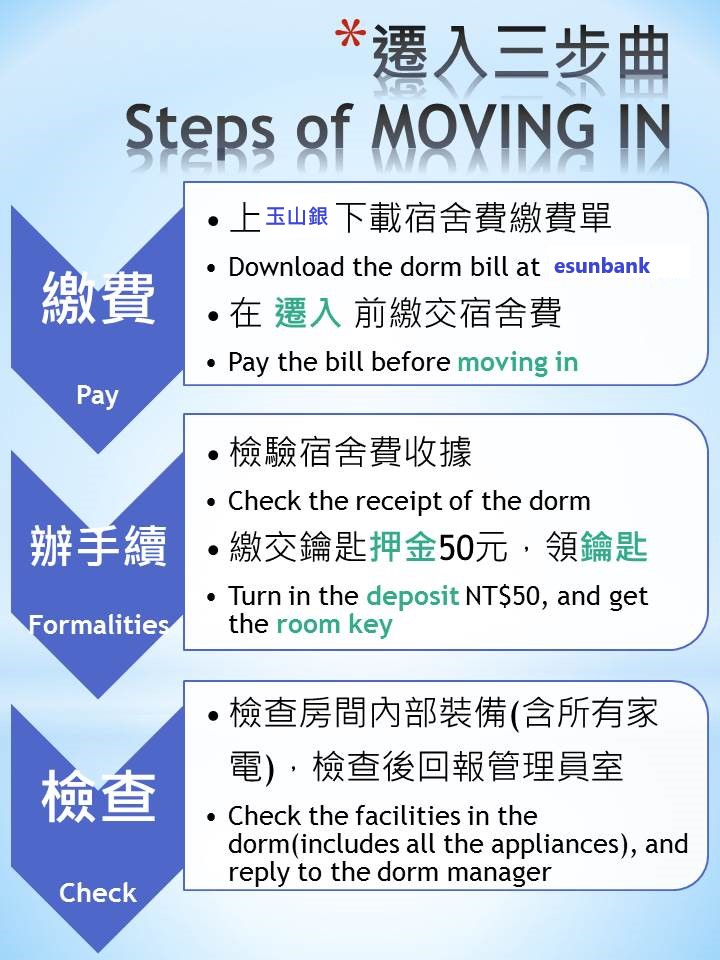 - 凡入住及搬離本校學生宿舍,皆須辦理遷入或遷出手續。