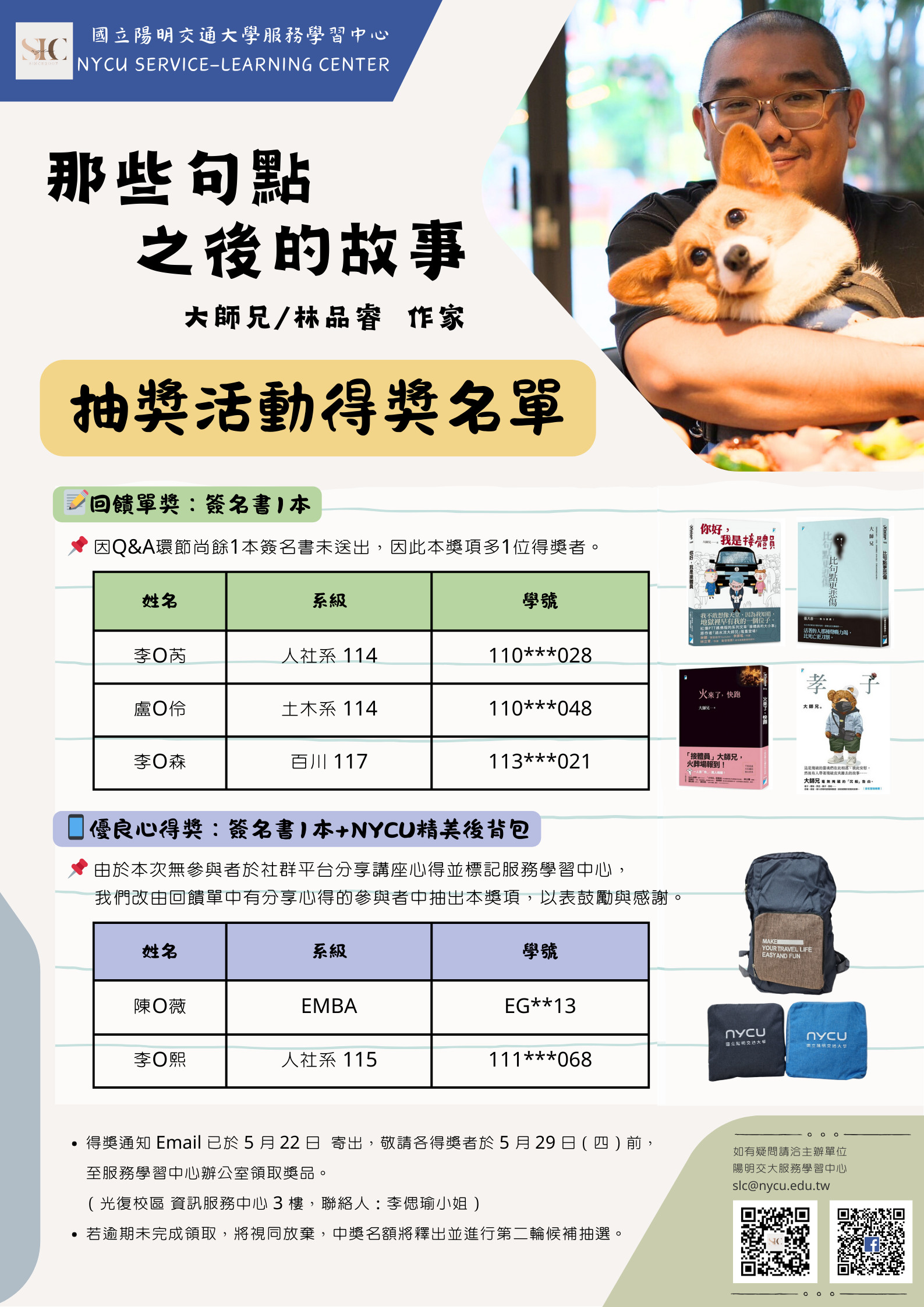 【抽獎活動得獎名單】5/20 服務學習講座─那些句點之後的故事