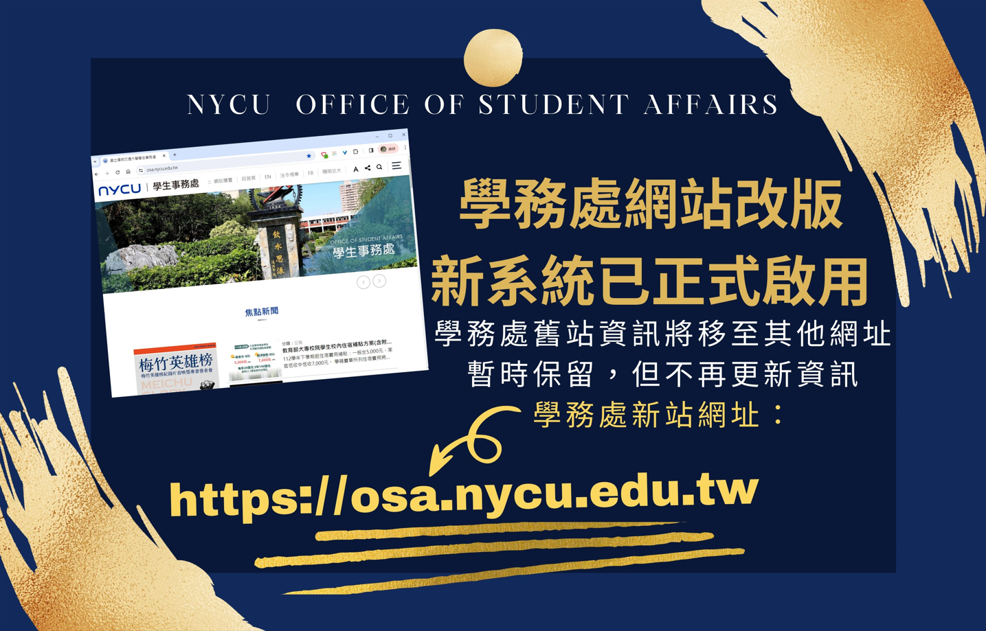 學務處網站已於2023/12/21改版,新系統已正式啟用,並使用原本學務處網址https://osa.nycu.edu.tw/繼續服務。