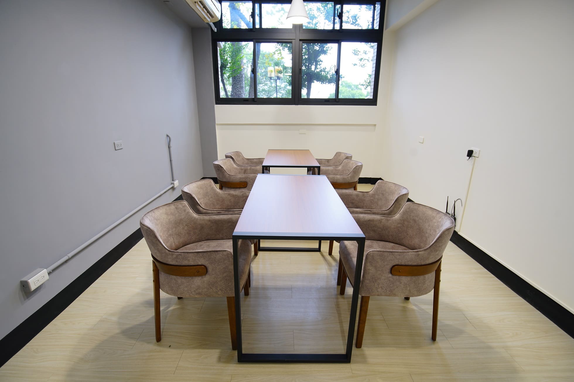 寢室設備:床架(須自備床墊,尺寸為:236 CM*96 CM )、書桌椅、衣櫃、冷氣