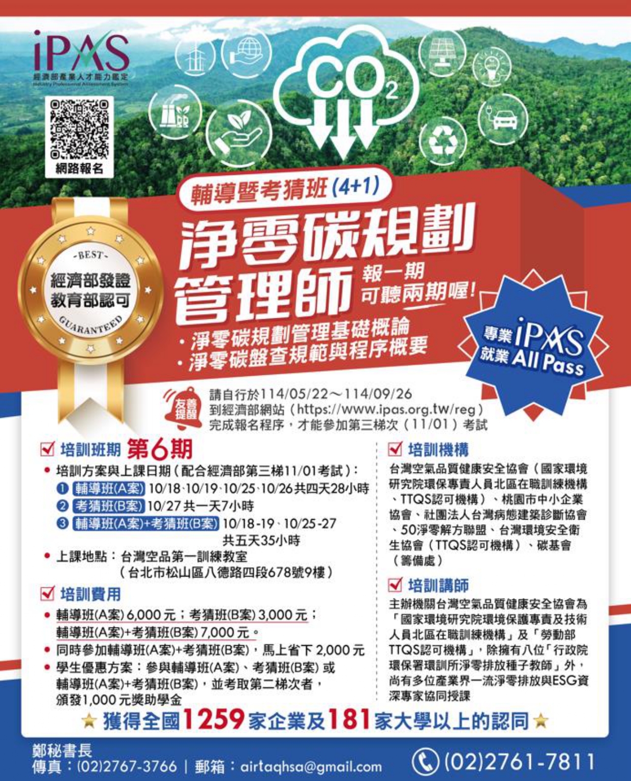 台灣空品辦理經濟部產發署114年度第三梯次「iPAS淨零碳規劃管理師(初級)」4+1考猜班輔導課程,竭誠歡迎有需求的朋友踴躍報名參訓。